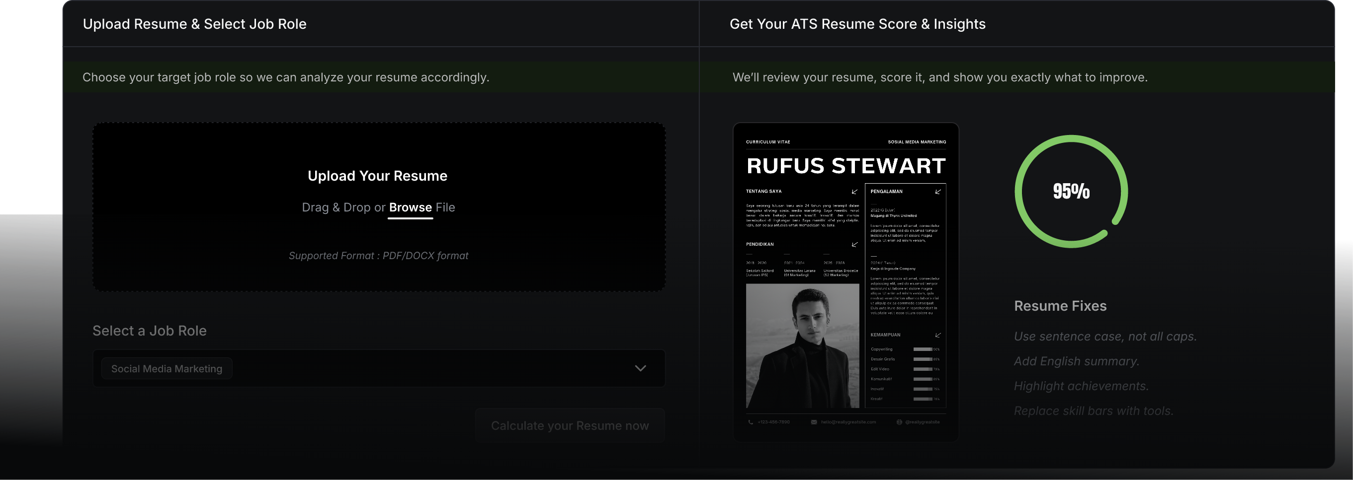 1. Upload Your Resume – Drag and drop your PDF or DOCX file—no signup required.
