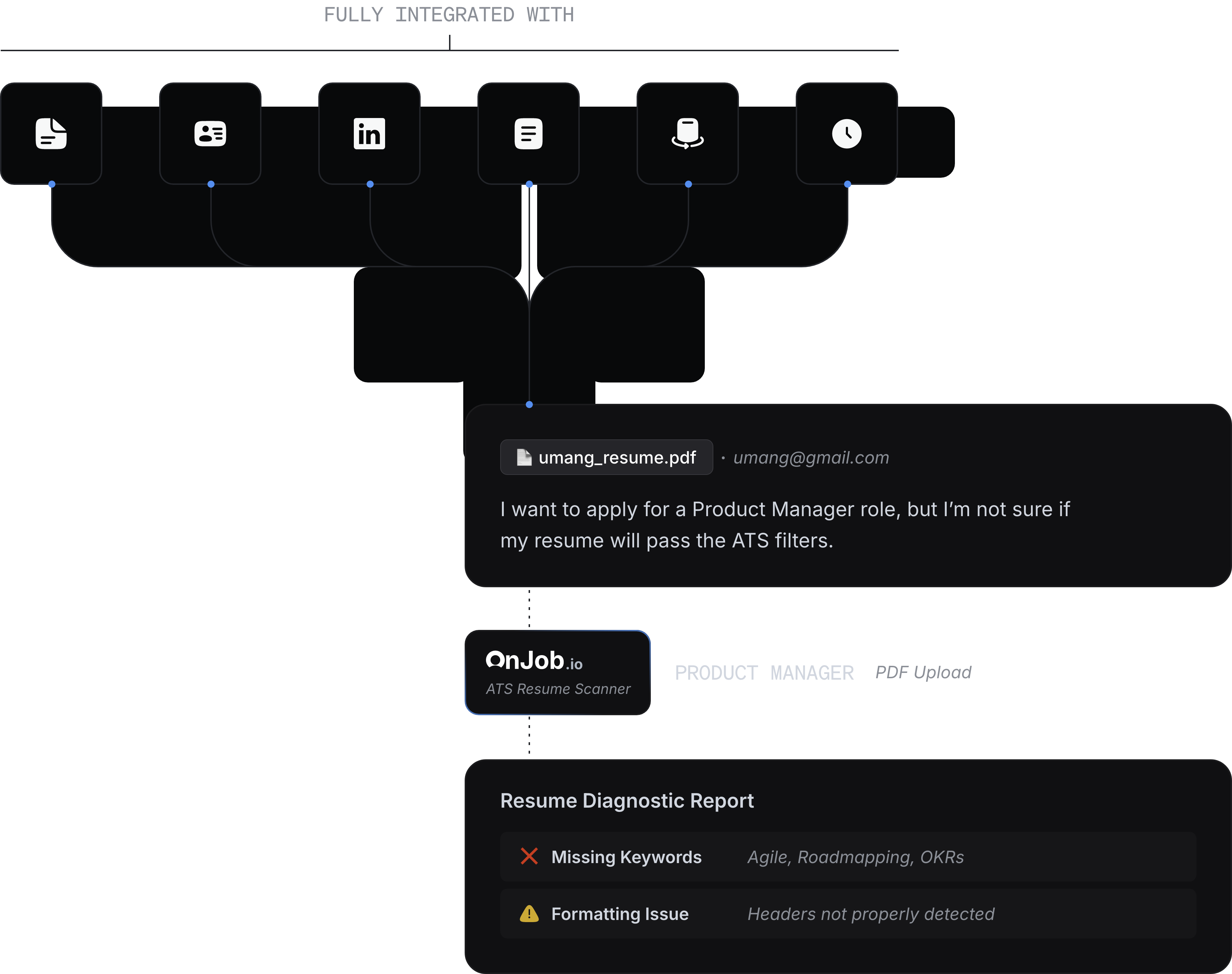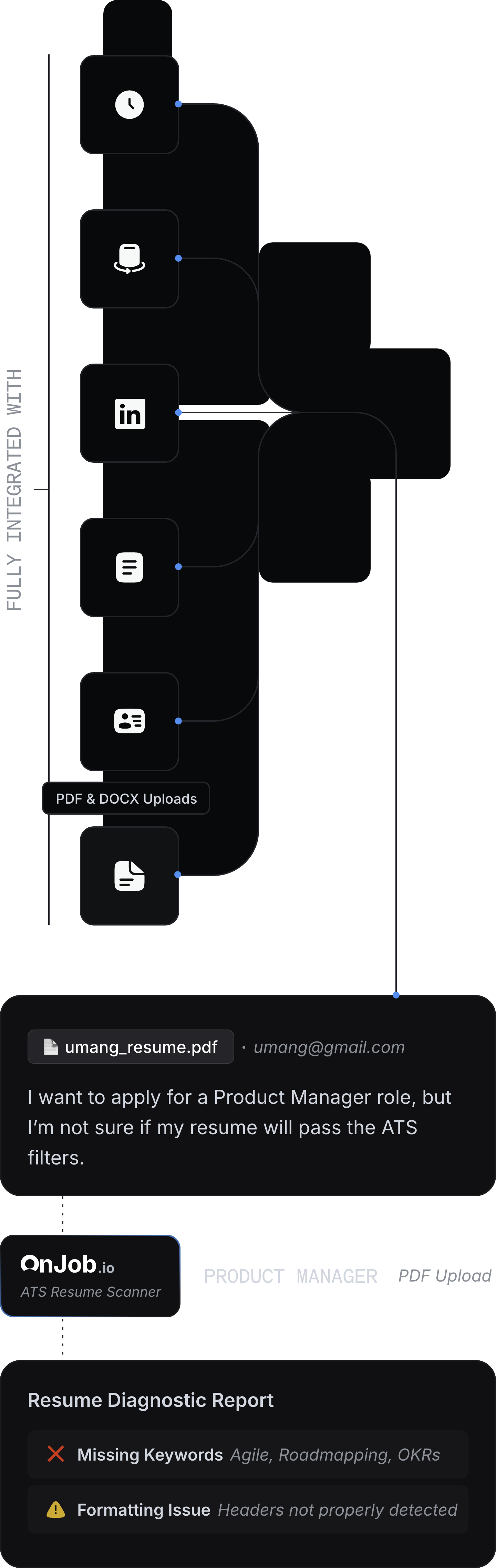 Upload your resume and get real-time insights pulled from the tools and platforms you already use. Whether you’re importing from LinkedIn, editing in a resume builder, or pasting job descriptions, OnJob.io automatically detects what’s missing and what’s hurting your chances.